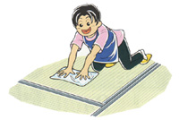 | A.お部屋の通気を良くし、雑巾を固く絞って(洗剤等は使わない) 余分な水分を畳が吸収しないようにして、畳の目に沿って拭いて ください。特に新しい畳は濡れ雑巾で拭くと畳が黒ずんだり しますので、必ず乾いた雑巾でカラ拭きしてください。 |